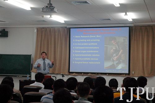 1016日下午,Robert Dennis教授在机械学院学术报告厅作了题为“BME System Development:Concept to Commercialization”的专题报告。报告中,Dennis博士结合自身教学科研经历,围绕生物医学工程发展及国外前沿动态、知识产业化进程、数字医药(Digi- ceutical)应用于干细胞(Stem Cell)生长等方面的内容进行了详细阐述。报告涉及生物医学、工程力学、材料科学等诸多学科研究领域。报告由机械学院院长金国光教授主持,机械学院副院长李亮玉、副书记杜玉红,学校相关专业领域师生80余人参加了活动。会场学术氛围浓烈,互动环节,参会人员分别就自己感兴趣的问题与Robert教授进行了积极交流,纷纷表示受益匪浅。