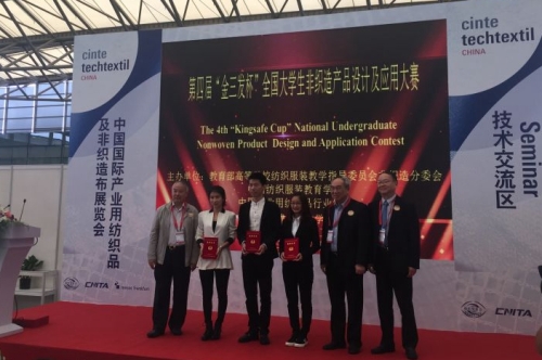 本届大赛的主题为“融合与创新”,经过初赛和复评,最终评选出特等奖一名,一等奖两名,二等奖七名,三等奖和优秀奖各十名,卫材单项奖一名。我校获得特等奖一项,一等奖一项,二等奖一项,优秀奖两项,在所有参赛院校中综合排名第一。其中,我校刘静、王雨、李娜、邹驰、徐与浓同学的作品“热风复合非织造保暖材料的设计与开发”获得此次大赛唯一一项特等奖,这也是我校连续四届获得此项大赛的最高奖项。