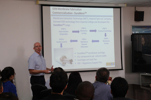报告会上,Andrew Livingston教授首先介绍了有机溶剂纳滤(organic solvent nanofiltration,OSN)膜材料发展历程;接着分析了当前OSN领域面临的科学和技术难题:膜通量衰减的原因及如何提高膜分离效率,讨论了界面层概念及分离过程中的浓差极化现象对OSN膜分离性能的影响;最后重点介绍了OSN膜透过率和选择性的关系并提出了精准分离(accurate separation)的思想,还详尽介绍了OSN膜在化工分离领域的广泛应用。