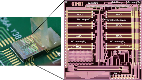 为解决该难题,张赞允教授及其研究团队创新性地提出了基于光栅耦合的8通道Lan-WDM硅光收发集成方案,集成芯片(图b)采用自研超高效率完全垂直光栅耦合器作为光学接口,采用交错型角度多模干涉仪实现超低损耗波分复用/解复用,采用硅马赫-曾德调制器和锗波导光电探测器实现高速光发射和光接收功能。经光封装后(图a)测试,芯片发射端光纤到光纤插入损耗仅约12 dB,信道非均匀度为1.44 dB;调制器和探测器带宽分别达到了45和47 GHz;在满足SD-FEC判决标准的前提下,光发射机和光接收机总通信容量分别达1.56和1.42 Tb/s,收发互连后总通信容量仍然高达1.18 Tb/s。为验证芯片在传输距离方面的优势,团队分别进行了2公里和10公里数据传输实验。结果显示,得益于Lan-WDM波段的低光纤色散,收发芯片可实现10 公里的单模光纤数据传输。